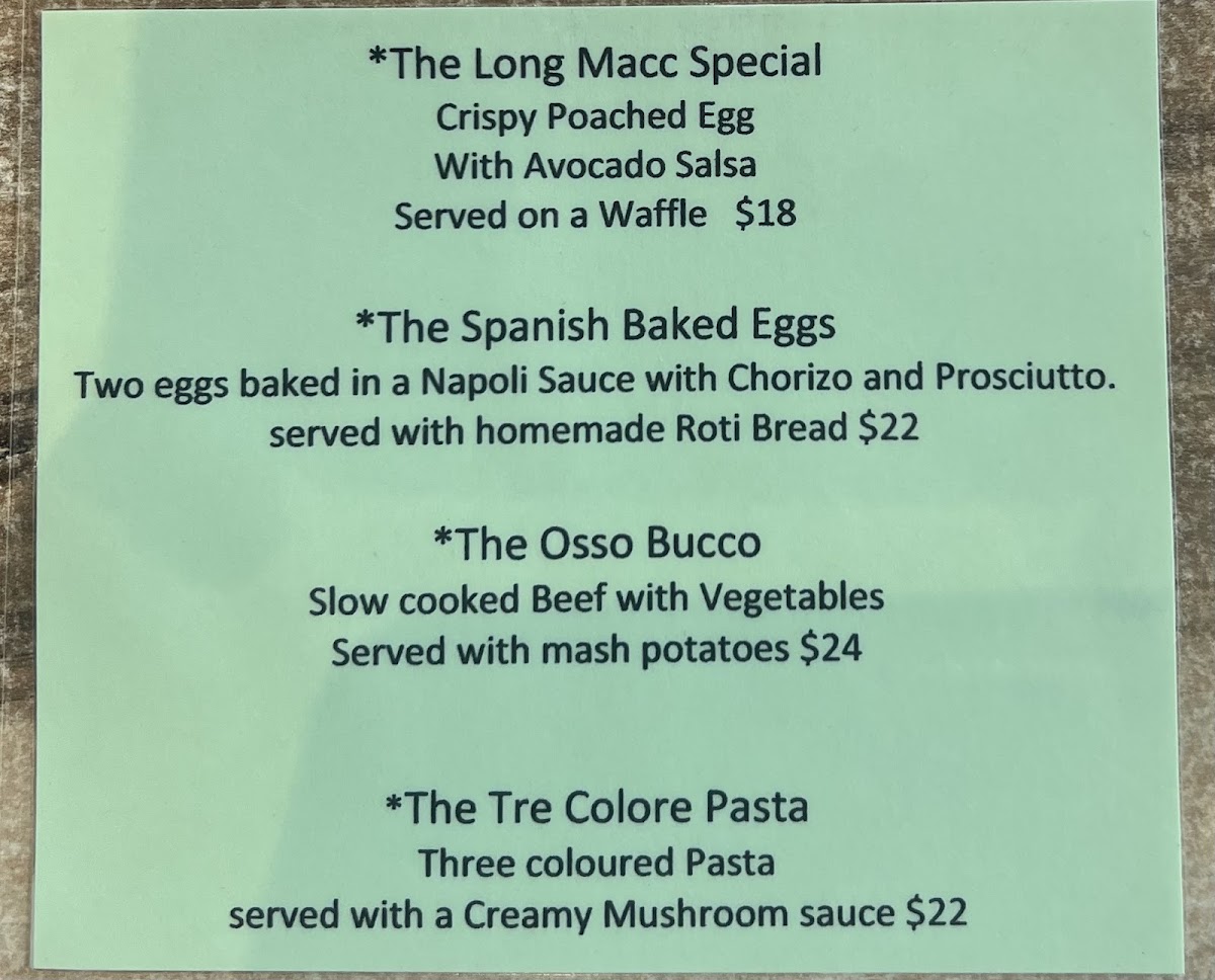 In summary, The Long Macc is more than just a cafe; it's a cherished local establishment that celebrates good food, great coffee, and even better company. With a menu that regularly features daily specials, there’s always something new to try. Whether you're a coffee connoisseur or simply looking for a delightful place to dine, The Long Macc has something special waiting just for you. Your next favorite meal is just a visit away!